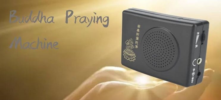 like the one pictured, but that he had obtained for free at a famous Hong Kong temple where they hand them out. I thought the idea of a machine that prayed was ridiculous, and yet I have listened to this 17 second loop for more hours than any favorite album. It is delightfully analog, with the om-ma-pad-ne-hom chant getting slower and deeper as the batteries die.